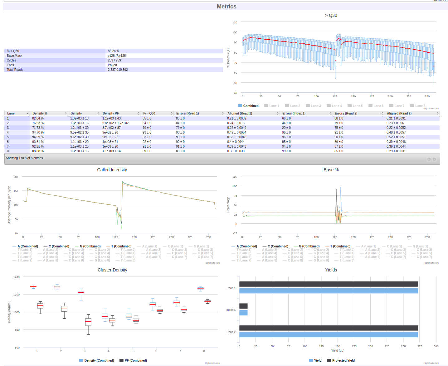 220120_A00469_0263_AH3YMFDSX3. Click on the run alias to go to the run page. - Scroll down to the Metrics section and examine the sequencing metrics for this run.